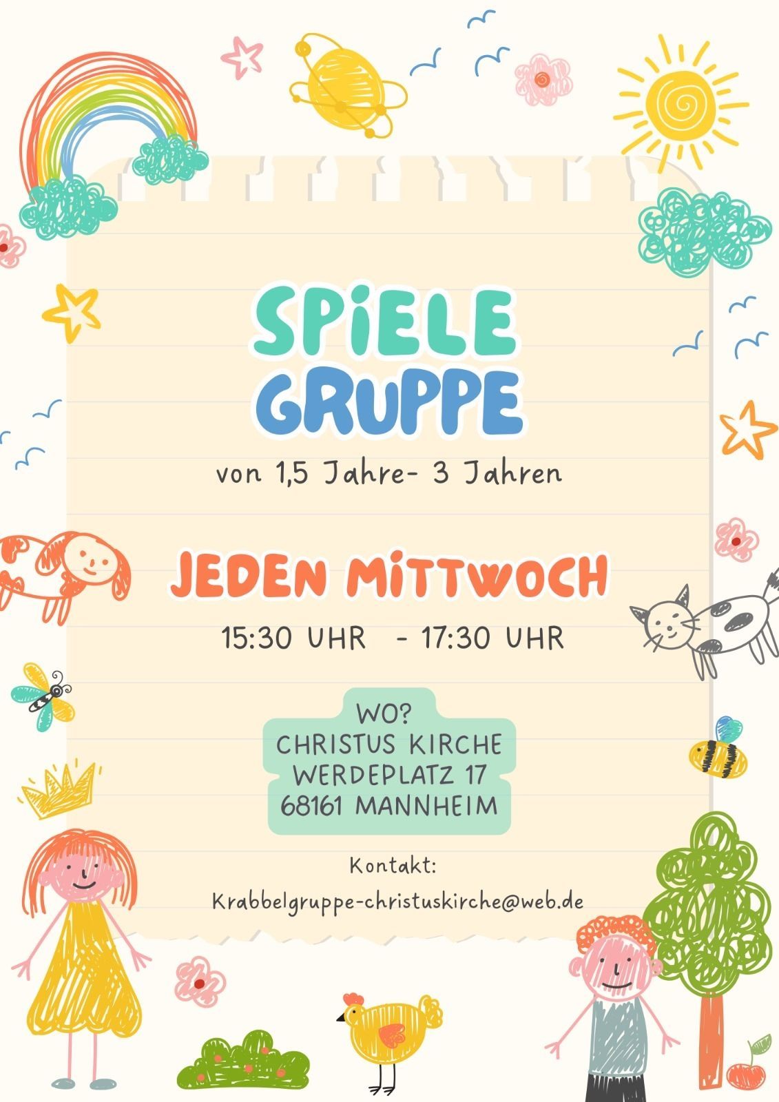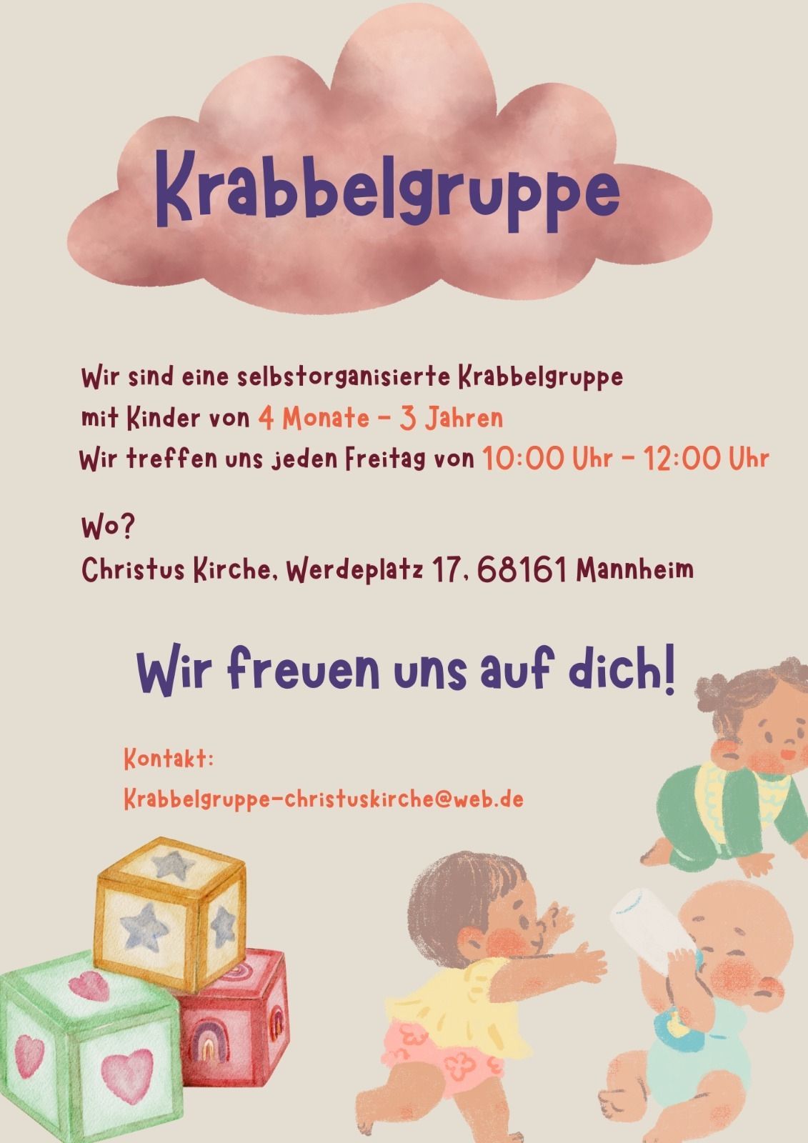 Wir möchten Ihnen gerne die Krabbelgruppe und die Spielegruppe der Christuskirche empfehlen. Die Gruppen wurden von engagierten Eltern ins Leben gerufen und finden jeden Mittwoch und Freitag statt. Es ist eine schöne Gelegenheit um sich mit den Kindern zum Spielen zu treffen, aber auch um andere Familien kennen zu lernen. Geimeinsame Themen, der Austausch mit anderen Eltern und eine entspannte Atmosphäre... Oft entstehen in diesem Rahmen langjährige Kontakte und Freundschaften.